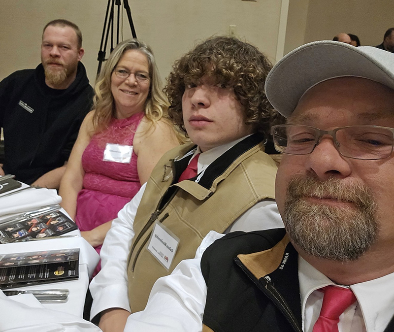 Team Blankenship paused for a quick selfie during the IMCA national banquet, as Colton Blankenship made the trip to Lincoln with (at left) brother Tyler and mother Karie and (at right) father and photographer Ray. Colton took home hardware, jackets and plenty of congratulations after winning four Karl Chevrolet Northern SportMod track titles and the Nevada State crown in 2025.