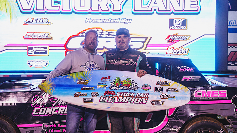 Mike Vandermark Jr. poses in victory lane after securing his second straight Clash On The Coast Sunoco IMCA Stock Car championship, joined by promoter Peyton Taylor. (Photo by AOM Creative)