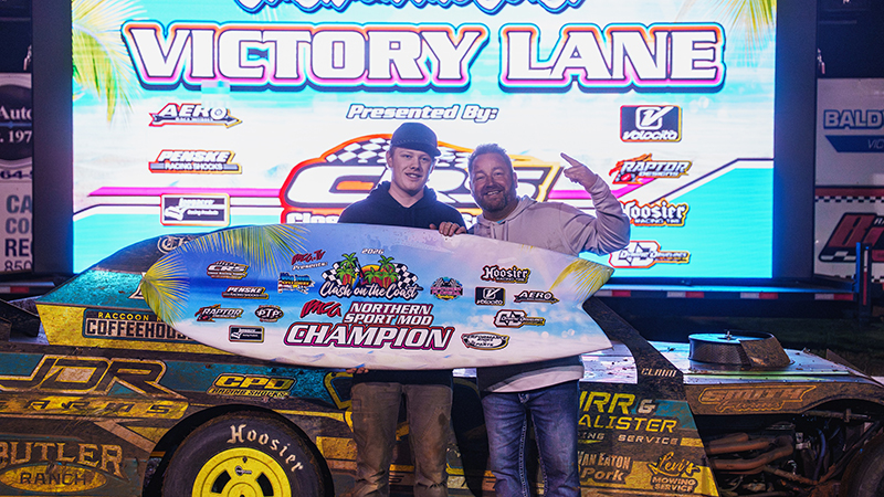 Mike Smith stands in victory lane after becoming the first-ever Clash On The Coast Karl Kustoms IMCA Northern SportMod champion alongside promoter Peyton Taylor. (Photo by AOM Creative)