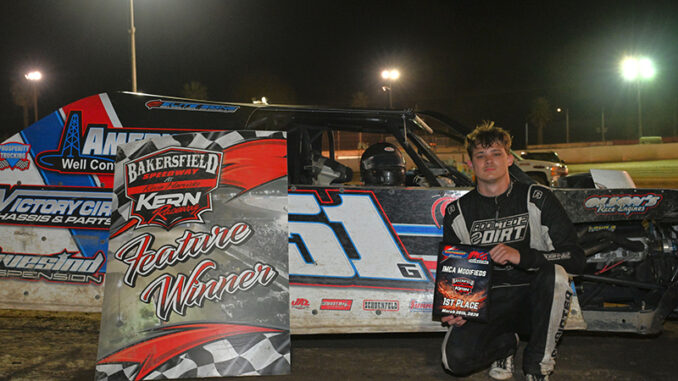 BAKERSFIELD, Calif. (Mar. 20, 2026) — Racing against one of the strongest Karl Kustoms IMCA Modified fields of the season, Gavyn Manning won his second consecutive feature at Bakersfield Speedway at Kevin Harvick’s Kern Raceway on Friday night. Manning outfoxed a field of 17 Modifieds for his second win in the DeVilbiss Racing Chassis Western Region after 30 laps of competition.