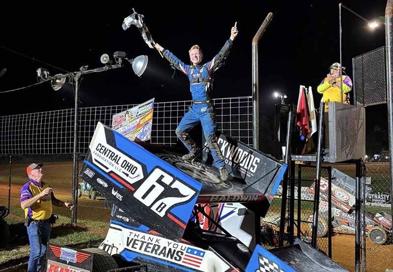 Dillan Baldwin celebrates atop his car after winning the $10,000-to-win Kevin Huntley Memorial on Sept. 5, 2025, at Bloomington Speedway. (Photo by Huntley’s Series)