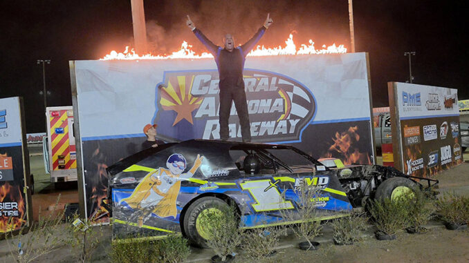 CASA GRANDE, Ariz. (Apr. 18, 2026) — Gerry Glenn got the jump at the start of the Karl Kustoms IMCA Modified feature at Central Arizona Raceway before a chaotic opening lap brought out a restart. Chad Ayers got loose in turn two, sending Jett Ayers up the track to avoid him. Jett’s move forced Terry Belcher Jr. into the wall, and in turn three, contact between Luke Silber and Ethan Stevens collected Bryan Gray, Todd Izzo, and Bill Slocum.
