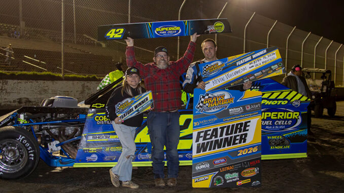 ELMA, Wash. (Apr. 18, 2026) — Grays Harbor Raceway opened its 2026 season with a strong showing in the Karl Kustoms IMCA Modifieds. Grey Ferrando led the opening 21 laps, setting a torrid pace and even putting cars a lap down.