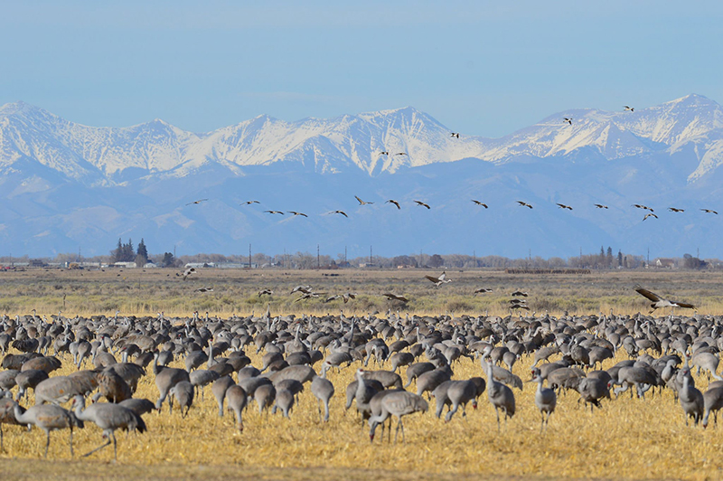 Thousands of sandhill cranes gather in the San Luis Valley during the annual Crane Festival, feeding in a barley field with the Sangre de Cristo Mountains rising in the background. (Photo by USFWS Mountain-Prairie)