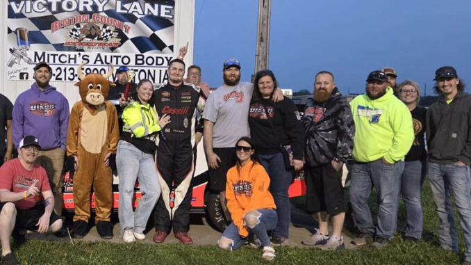 Vinton, Iowa (Apr. 26, 2026) — A stellar field of cars put on a show at The Bullring for opening night at Benton County Speedway as Kyle Olson held off a hard-charging John Oliver Jr. to win the Sunoco IMCA Stock Car feature.