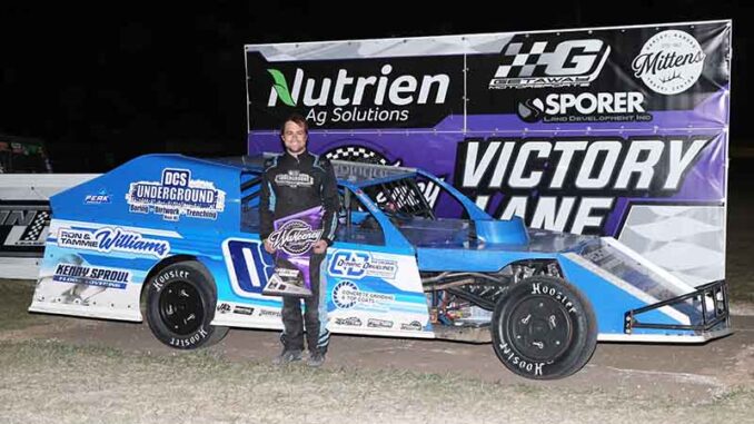 WaKEENEY, Kan. (Apr. 25, 2026) — Dakota Sproul completed a dominant weekend sweep in the Karl Kustoms IMCA Modifieds, leading the way in Saturday’s twenty-lap feature at WaKeeney Speedway’s Christmas City Clash.