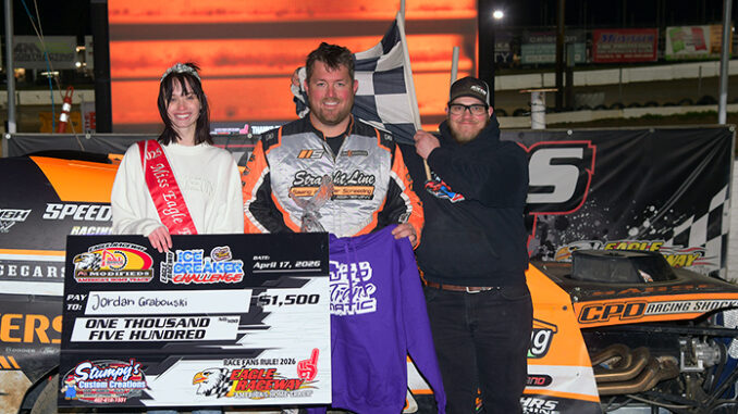 By Greg Soukup EAGLE, Neb. (Apr. 17, 2026) — Grabouski Dominates Icebreaker Modified Main at Eagle The Karl Chevrolet IMCA Modifieds capped opening night of the 2026 Icebreaker Challenge at Eagle Raceway on Apr. 17 with a $1,500-to-win main event. Josh Most led early, followed by Brandon Verbeek, Chevy Hadan, and Jordan Grabouski. Grabouski moved into second on lap two while Drew Janssen worked his way to third shortly after. The race’s turning point came on lap five when Most jumped the cushion in turns one and two, nearly flipping and surrendering the lead. On the restart, Grabouski took control as battles continued behind him, with Janssen, Cody Laney, and Izac Mallicoat all moving forward through traffic. From there, Grabouski pulled away to a straightaway victory. Janssen finished second, followed by Laney, Mallicoat, and Dustin Andersen. It was Grabouski’s third win of the season and his second in the Jet Racing Central Region in 2026. The race was a Fast Shafts All-Star Modified Invitational qualifier, and the Beatrice driver is already on the eligibility list to [Read More]
