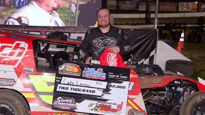 By Chance Riley JEFFERSON, S.D. (Apr. 10, 2026) — The Sunoco IMCA Late Models set the tone for the night at Park Jefferson Speedway, with Jesse Sobbing of Malvern, Iowa taking the early lead from Jordan Krug. Sobbing paced the field but had to withstand a last-lap slider attempt from Zach Zeitner, holding on at the line for his first Late Model win of the year and his second Speedway Motors IMCA Weekly victory of 2026, following a Sunoco IMCA Stock Car score during the Beatrice Spring Nationals. Zeitner finished second, followed by Krug, Landen Rojewski, and Cody Thompson. The Sunoco IMCA Stock Cars delivered a strong run as Mike Vondrak led much of the feature before Dan Mackenthun went to work. Charging from 11th, Mackenthun methodically worked the bottom groove to take over and drive away to his first EQ Cylinder Heads Northern Region win of the season. The Hamburg, Minnesota driver piloted the Jared Fasching-owned no. 7X to victory. Travis Barker was second, Ryan Harris third, with Greg Peck and Jordan Rogotzke completing the [Read More]