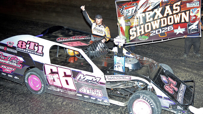 By J.M. Hallas PLEASANTON, Texas (Jan. 9, 2026) — The 25-lap, $1,500-to-win IMCA Modified main for night three of the Texas Showdown at I-37 came to green with Jordan Grabouski and Dean Abbey staying wheel to wheel into turn one. Steven Whiteaker Jr. had a big run coming off the very top, but it was Grabouski leading lap one, chased by Whiteaker, Abbey, Cody Laney, and Jeff Taylor in the top five. Abbey used the bottom to take second from Whiteaker on lap two, with Taylor grabbing third a lap later. The yellow waved on lap six, and when things got back under green, Grabouski got away while Laney tried the high side and fell back, and G.W. Egbert IV moved into the top five. Halfway through, Grabouski had built a half-straightaway advantage over Abbey, Taylor, Whiteaker, and Egbert. With five to go, Abbey was closing slightly as Grabouski encountered traffic. Each lap, Abbey picked up a car length or so, while Grabouski worked through slower cars, all of which were running the bottom. With two [Read More]